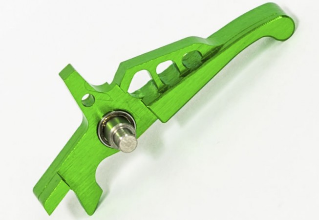 Gatillo compatible para Gearbox V2 fabricado en aluminio 7075 mecanizado CNC. Nuevo sistema con rodamiento de 6mm y eje en acero Inox. Su especial diseño en Aluminio junto al rodamiento 6mm le confieren un tacto suave y rápido al disparo optimizando el recorrido del gatillo. Disponible en tres colores Rojo, Verde y Negro.
